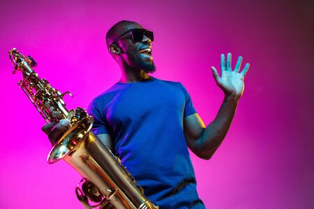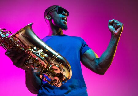 Young african-american jazz musician playing the saxophone on pink studio background in trendy neon light. Concept of music, hobby. Joyful attractive guy improvising. Colorful portrait of artist.