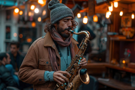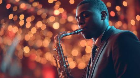 Experienced saxophonist performing soulful jazz in dimly lit venue with warm bokeh lights and a sophisticated ambiance.