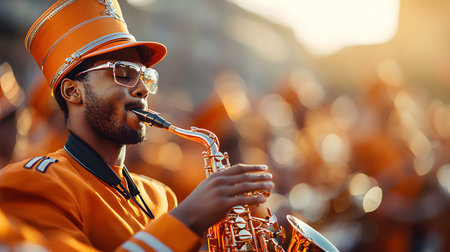 A focused saxophonist dons an orange uniform while performing, surrounded by blurred band members, capturing excitement and unity.