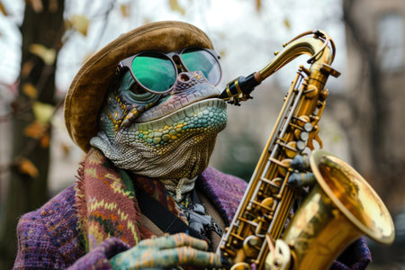 Trippy illustration with hippie jazzman or musician tropical chameleon plying saxophone, anthropomorphic eccentric lizard wearing bold colors suit, AI generated