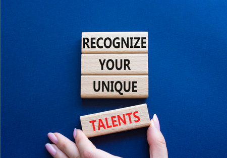 Unique Talents symbol. Concept words Recognize Your Unique Talents on wooden blocks. Beautiful deep blue background. Businessman hand. Business concept. Copy space