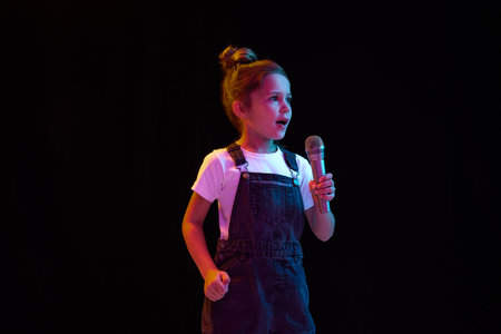 Stylish little girl, pupil in white t-shirt and denim dress singing at microphone isolated over dark background in neon light. Concept of beauty, kids fashion, children emotions