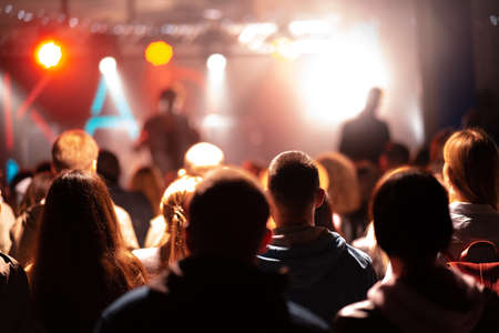 Concert and audience. People watch a group of musicians and a singer performing on stage. Smoke from a smoke plant