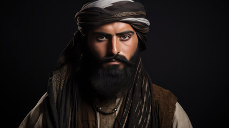 Close-up portrait of a confident Arab man wearing a traditional headscarf, showcasing striking facial features and a serene expression. The image captures cultural heritage and personal strength.