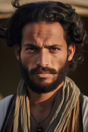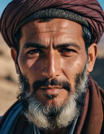 Closeup portrait of a bearded man with thoughtful expression, wearing a patterned headscarf and traditional attire, illuminated by soft natural light with a blurred bokeh background