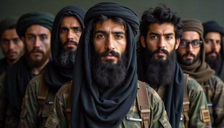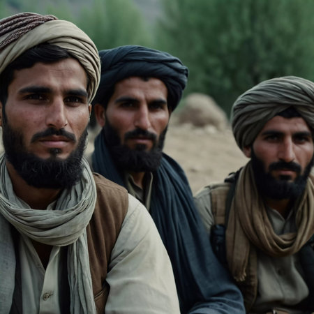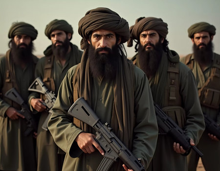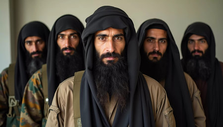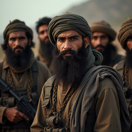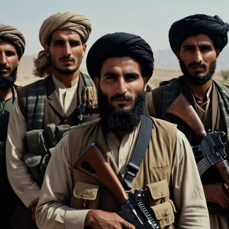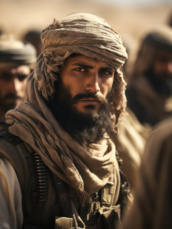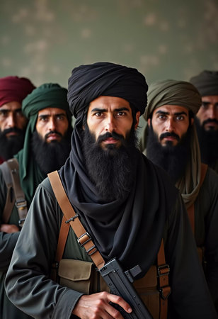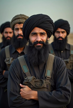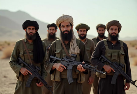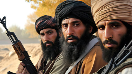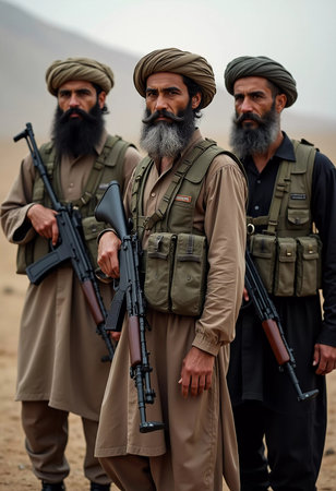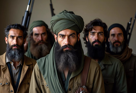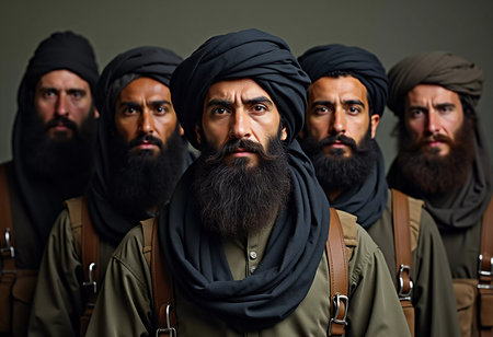 A group of Taliban soldiers stood together, their hardened expressions etched with the weight of their cause. In their eyes, a mix of determination, camaraderie, and allegiance. A solemn portrait capturing the complexities of their shared journey in a world engulfed by conflict. Generative AI