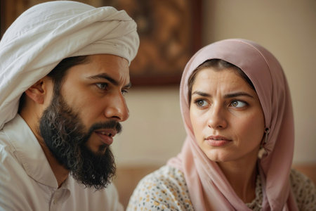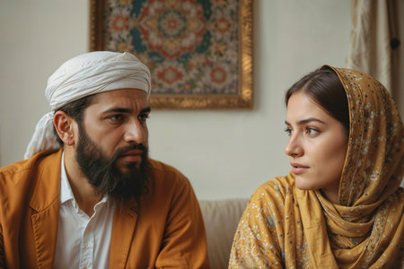 Portrait of serious, upset Muslim couple, Arab woman in hijab and Arabian man in living room