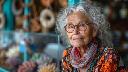 Portrait of an elderly woman with glasses at a souvenir shop