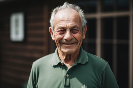 Portrait of smiling senior man in green polo shirt standing outdoors