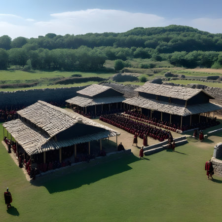 Roman soldiers camp before the battle with soldiers and weapons