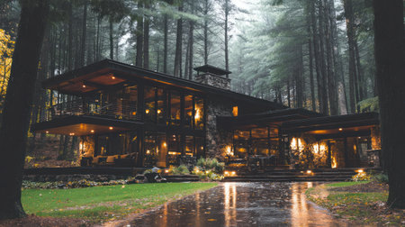 A contemporary house is nestled within a dense forest environment, showcasing expansive windows and warm interior lighting. The composition highlights a combination of natural elements with architectural design, creating a sense of tranquility. It might be suitable for promotional materials concerning real estate, architecture, or lifestyle content.