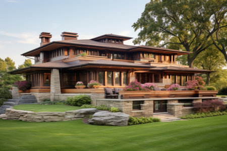 This image showcases a grand house with a generous front lawn, A Frank Lloyd Wright-inspired prairie house, AI Generated