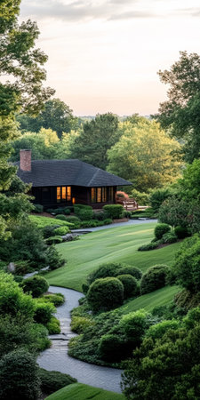 Soft sunlight casts a warm glow on a charming house surrounded by vibrant greenery and manicured shrubs. A tranquil pathway leads through the lush landscape on a peaceful evening.