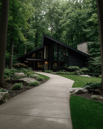 A contemporary house is nestled amidst a lush forest landscape. The architectural design features angular lines and dark tones, complemented by a concrete pathway winding through the greenery. The photograph showcases an exterior view, with possible applications in real estate, design, or lifestyle content. The composition offers ample copy space and a natural setting.