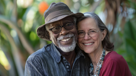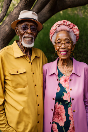 An AI generated illustration of a happy retired Afro-American couple happy in love standing in a park and Looking at the camera