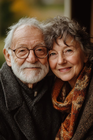 Two elderly individuals share a joyful moment, smiling and embracing each other in a natural outdoor setting adorned with autumn colors, showcasing their bond and happiness.