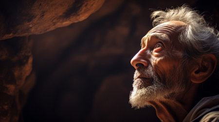 An elderly man with silver hair and deep-set eyes reflects on life, his serene expression illuminated by the warm glow of the setting sun.