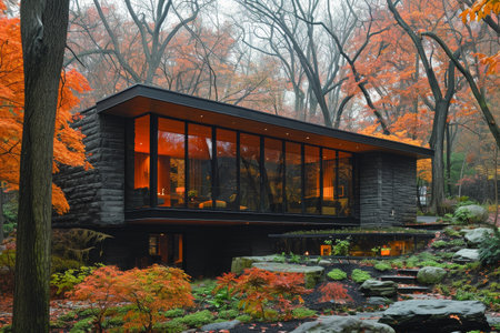 A long, modern house with large glass windows and a flat roof sits amidst an autumn forest. The scene features vibrant green lawns and colorful foliage in a natural setting. The image's composition, with its symmetrical lines and use of light, is suitable for various commercial and editorial applications.