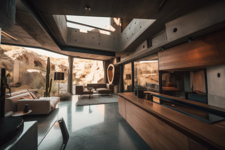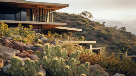 sleek hillside house design by olson kundig captured in a close-up shot, showcasing the raw beauty of brutalist architecture. the foreground features a blurred cactus, adding a touch of nature to the composition. shot in 8k resolution with a cinematic approach, the image boasts professional color grading, epic volumetric lighting, and sharp focus. taken with a sony alpha a7 iii camera and a sony fe