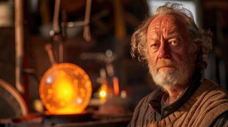 The picture of the glass blower that has been making the glass by heat up and reshape it inside the workshop, the glass blower require skills like shaping technique, experience and knowledge. AIG43.