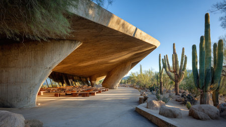 This striking image showcases modern architecture harmoniously integrated with a desert landscape, featuring large cacti and a captivating structural design.