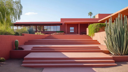 This striking image showcases a modern home with a bold red exterior, inviting entrance, and unique steps surrounded by desert plants under a clear blue sky.