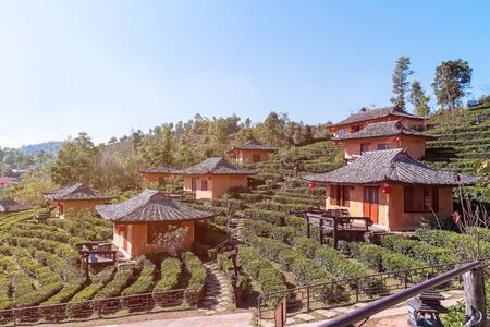View of Lee Wine Rak Thai resort with the sunrise in Maehongson, Thailand.