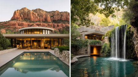 Two modern residences are displayed, each showcasing unique architectural designs. One features a pool with mountain views, while the other incorporates a waterfall and natural elements. The images showcase clean lines, glass, and a blend of natural and man-made features, suitable for various editorial and promotional applications.