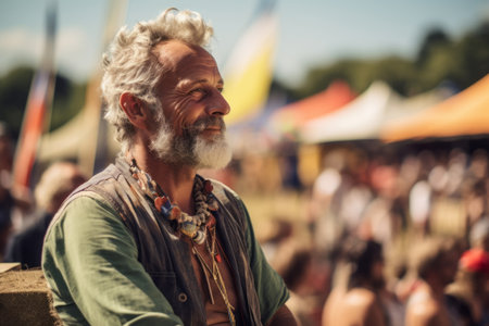 In a lush garden, an older gentleman with beautiful curly hair and a gentle smile enjoys a serene moment under the sun, exuding warmth and wisdom. Nature embraces him.