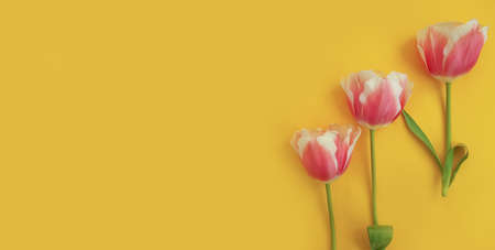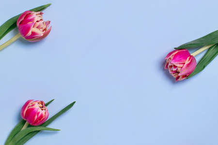 Floral background with copy space. Flat-lay frame of tulips. Womens day, mothers day greeting card