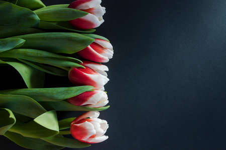 Bouquet of fresh red tulip flowers sitting on dark surface background with copy space