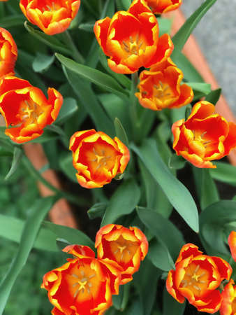 Beautiful colorful terry tulips in full bloom in the garden, view from above against dark green leaves. Natural floral texture for background.