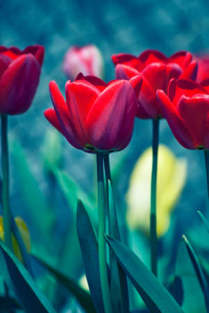 Red tulips opened their buds in spring