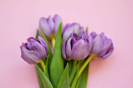 mothers day background. view from above. Beautiful bouquet of purple tulips on a purple background.