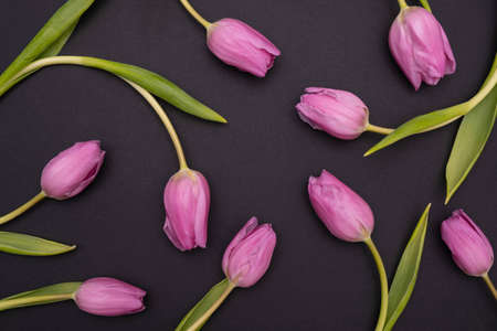 beautiful pink tulips are laid out on a black background, close-up