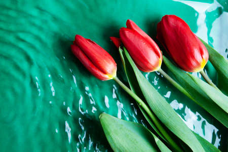 Holiday Bouquet of Red Flowers on green background with water. beautiful background of fresh tulips, symbol of warmth and spring . mock up