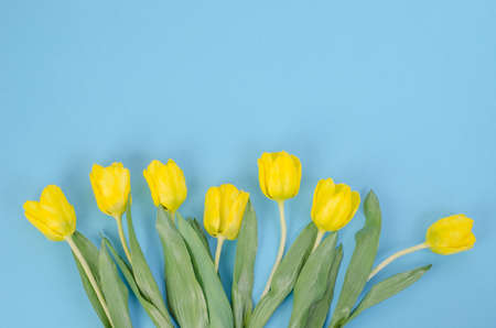 Greeting card background for spring holidays, yellow tulips on a blue background, with copy space