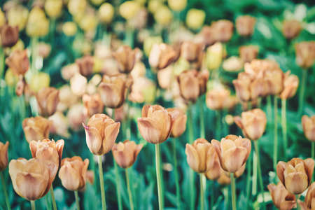 Stylish background with orange tulips and a spring flower bed, toned image wallpaper, card for mothers day.