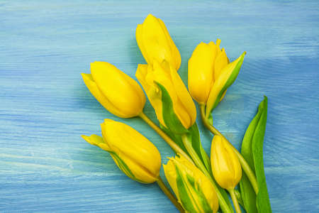 Yellow tulips on a blue background. A copyspace. The concept of a spring, greetings, birthday.