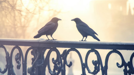 Two intelligent crows perch on an ornate railing, facing each other in a quiet moment. A soft morning mist surrounds them, creating a dreamy urban atmosphere.