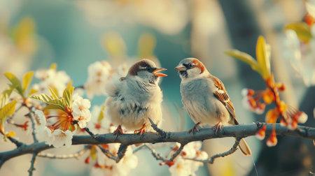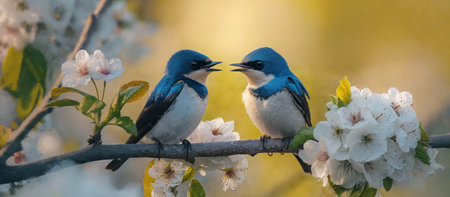 Birds sit on a flowering branch in the garden and sing. Generative AI.