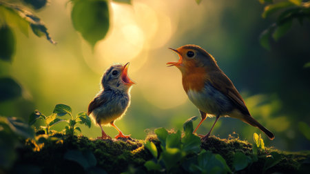 A baby bird with its mouth open wide, begging for food from a parent bird perched nearby, captured in a vibrant green garden during the golden hour