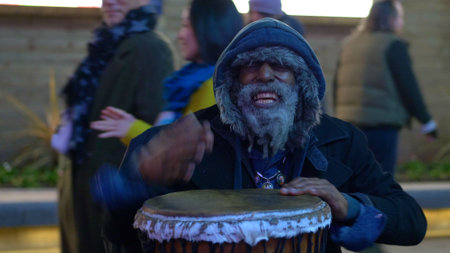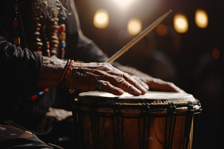 Black adult man playing traditional drum with both hands during Kwanzaa celebration, close up on hands and drum surface, capturing cultural expression and heritage