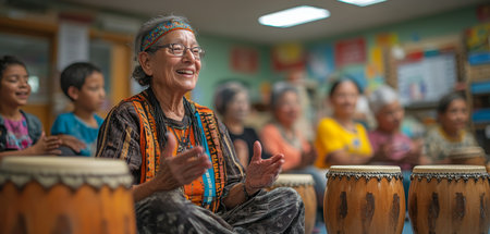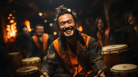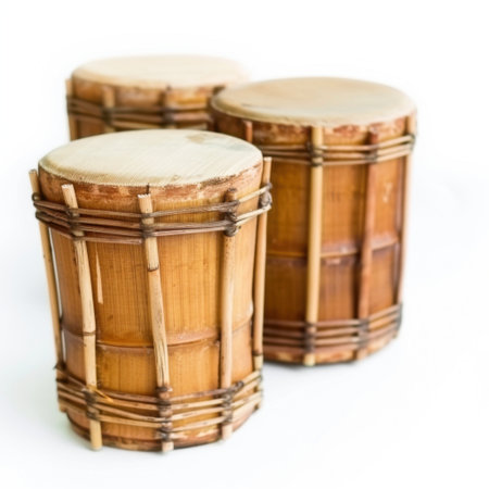 Hands gently touch a beautifully crafted drum, bringing rhythm to village life. Surrounding straw adds to the earthy atmosphere, as music fills the air with joy and connection.