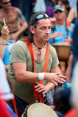 Montreal, Canada - June, 2018. Male Caucasian percussionist plays djembe drum bongo in the crowd at Tam Tams festival in Mount Royal Park, Montreal, Quebec, Canada. Editorial use.