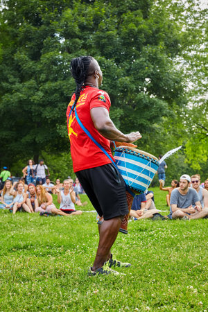 Montreal, Canada - June, 2018. Young African male percussionist plays djembe drum bongo in front of the audience at Tam Tams festival in Mount Royal Park, Montreal, Quebec, Canada. Editorial use.