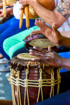 Percussionist playing a rustic and rudimentary percursion instrument atabaque during Afro-Brazilian cultural manifestation