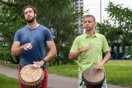 Krasnoyarsk, Russia, June 30, 2019: two European men play African drums in a public Park in the summer