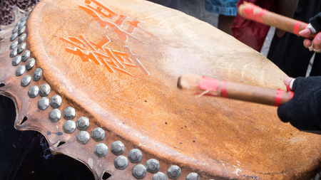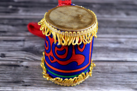 Old leather drum and drumsticks - membrane musical instrument. Ancient ethnic music on a folk festival. Timpani or kettledrums - old musical instruments in percussion family of classical orchestra.