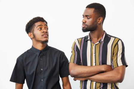 Two african american men with dark skin standing together in casual clothing on white background. One man looks at camera while the other looks at him with serious expression.